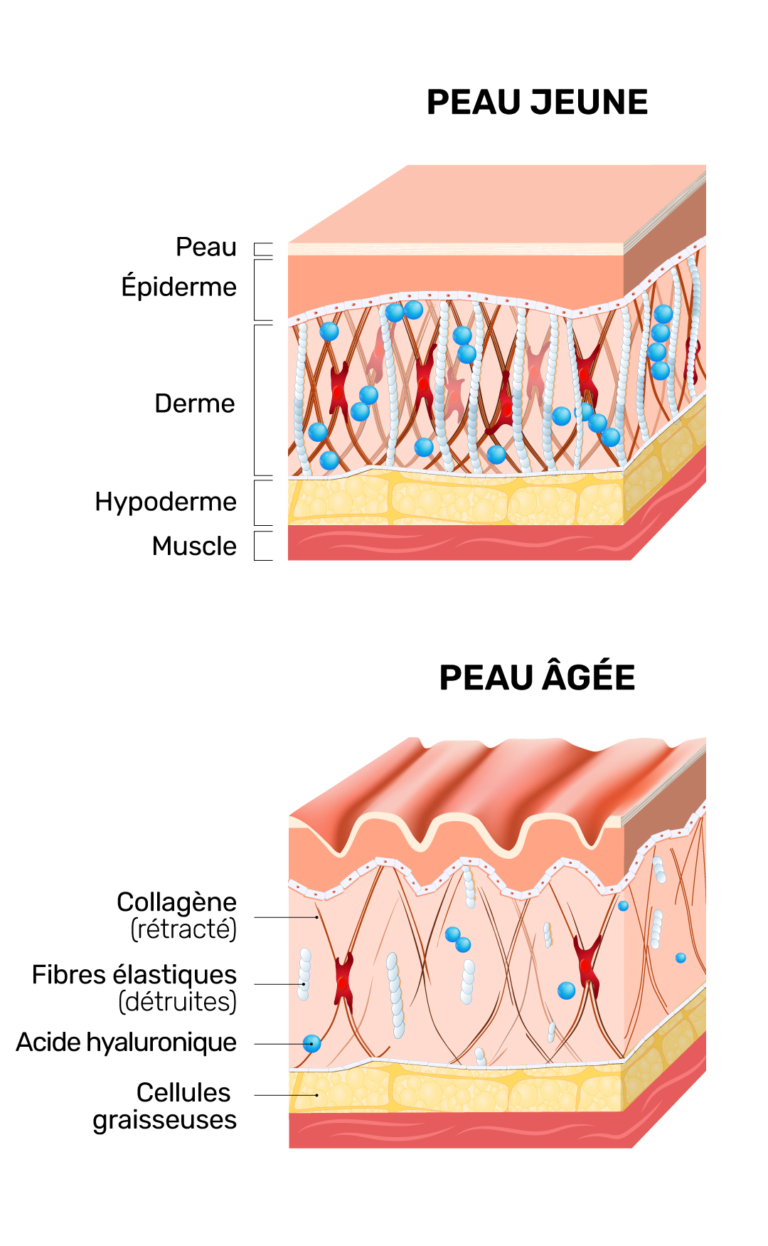 La perte de collagène a des conséquences particulières : Les fibres de collagène se fragmentent, deviennent plus courtes et moins nombreuses. Les fibres perdent alors leur capacité à retenir l'humidité, ce qui entraîne une perte de tonus et la formation de rides.